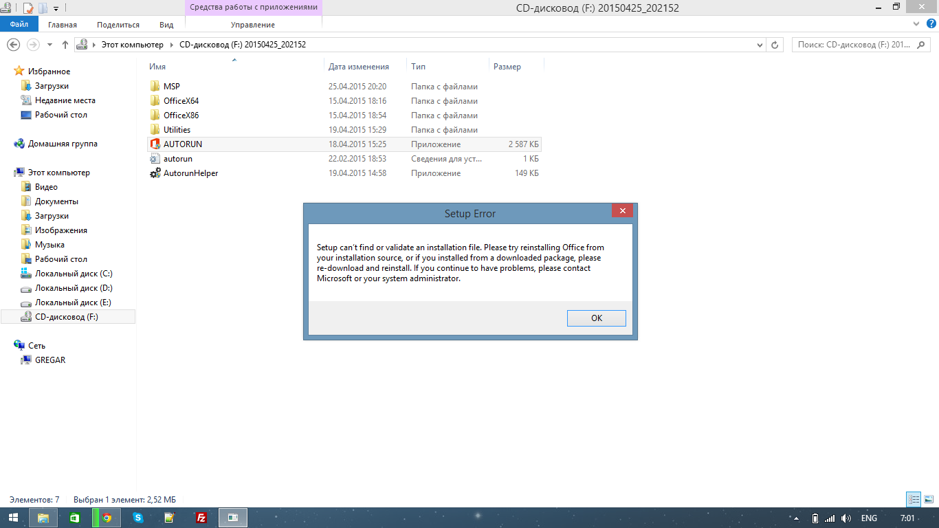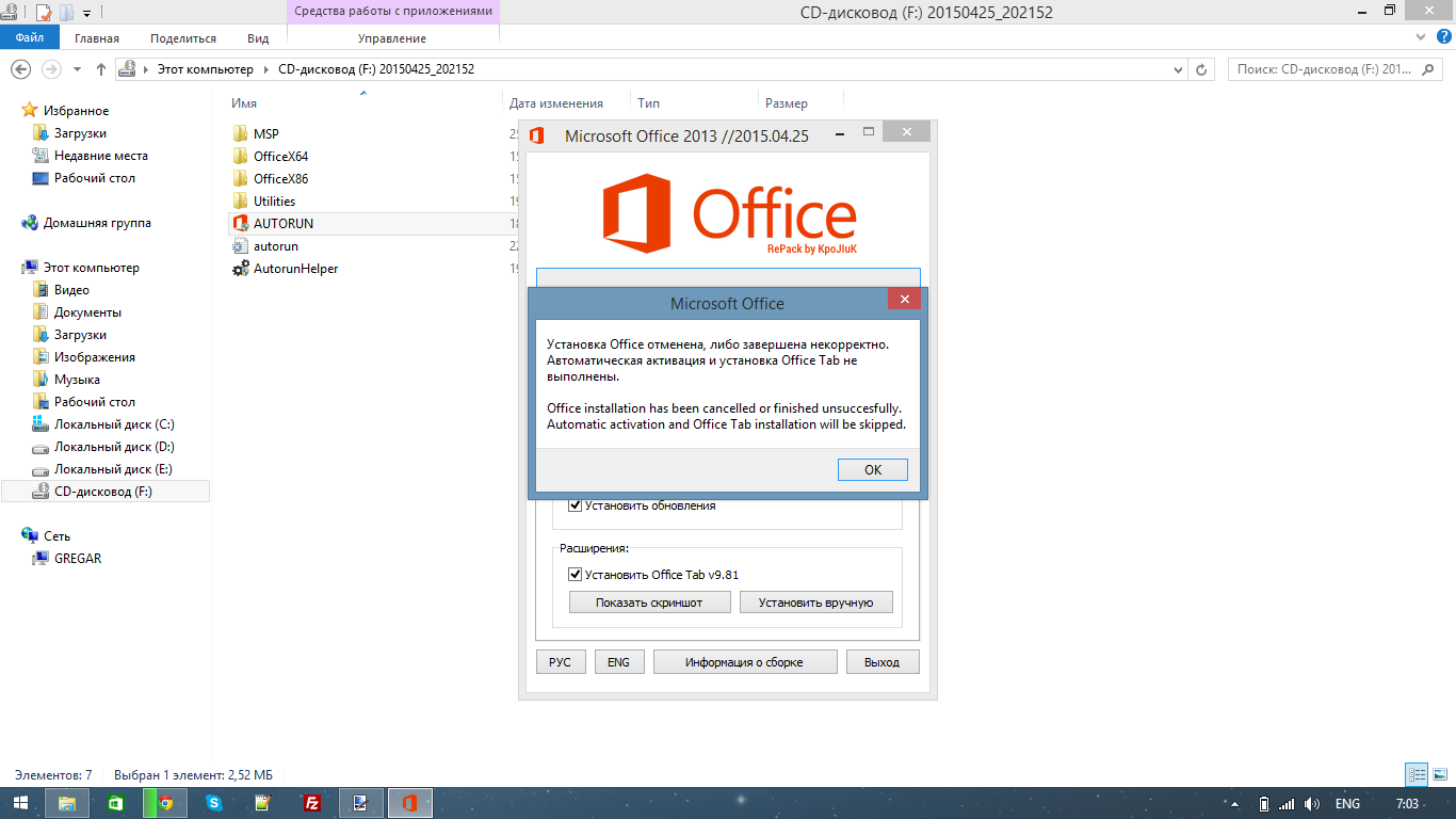Скачал iso образ пакета Microsoft Office 2010 SP1 (7,07 ГБ), но при попытке установиться вылетает ошибка на английском, а затем на русском... смысл ошибки: вы не можете установить этот пакет обратитесь к админу или в microsoft. У меня стоит Windows 8.1 PRO x86
